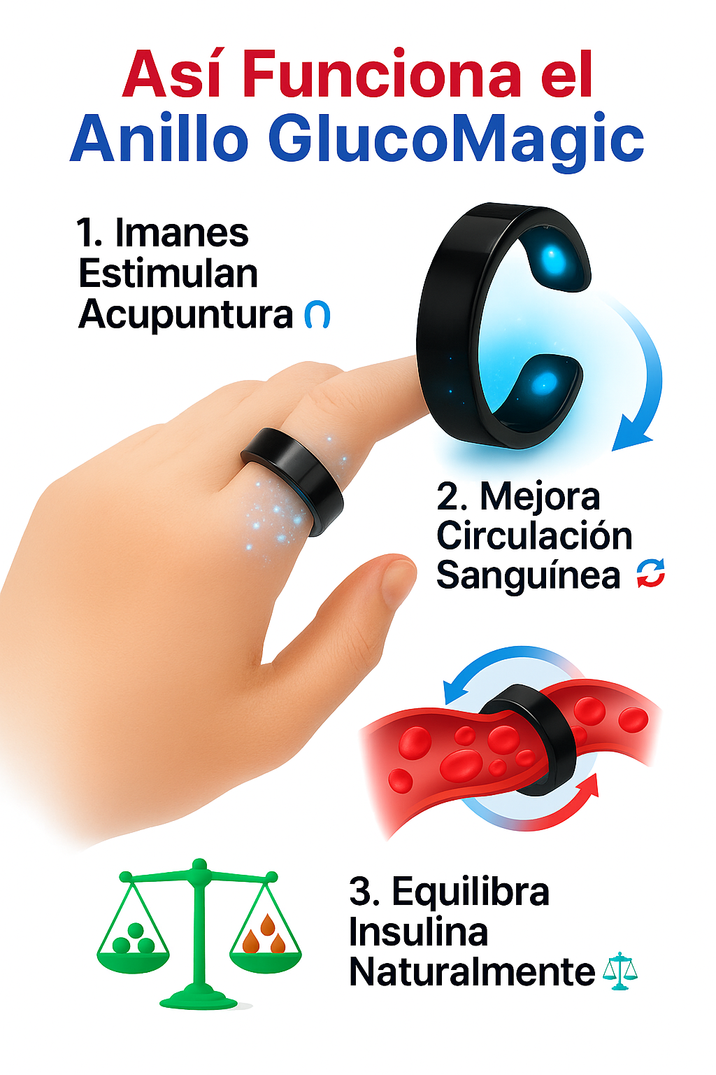 El anillo utiliza principios de acupresión y estimulación magnética que ayudan a equilibrar el organismo, promoviendo una mejor circulación y contribuyendo al control natural de los niveles de azúcar en la sangre.